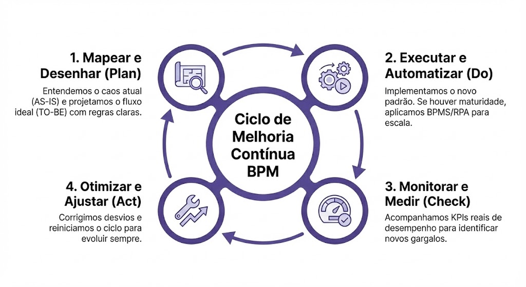 O Mapeamento (BPMN) é a etapa de inteligência onde desenhamos as regras do jogo: identificamos gargalos, definimos responsáveis e padronizamos o trabalho para que a empresa não dependa da memória das pessoas.