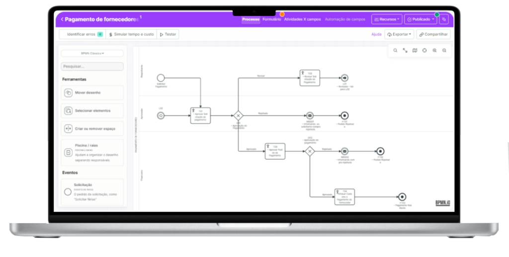 Já o BPMS (com Zeev) é a tecnologia que entra em seguida para dar velocidade, transformando esses desenhos em fluxos digitais que eliminam papel e e-mails.